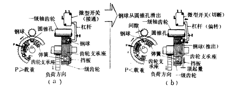 圖b為超負荷狀態,符合扭矩超過彈簧力時,二級軸齒輪和一級軸齒軸分離,鋼球從圓錐孔推出,擋板被頂出。擋板推動杠桿偏轉時,操作回路的微型開關切斷,停止運轉。