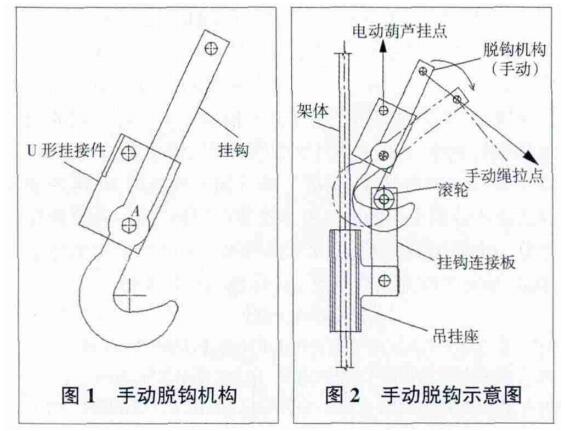 手動鉤體基本構成。如圖1所示脫鉤機構,主要由掛鉤和 U 形掛接件組成,U形連接件通過銷軸與掛鉤連接在一起,掛鉤可繞 A 點(銷軸)轉動。