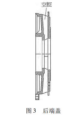 當電機質(zhì)心變化時,吊環(huán)螺釘可以跟著移動,只需用緊定螺釘將吊環(huán)安裝板固定在合適的位置,還優(yōu)化就可以確保吊環(huán)螺釘總是在電機的質(zhì)心處,使電機在吊裝時總是平衡的。冷卻風可以通過通風口流通,不會被電機接線盒阻擋,可以有效降低出線盒處的溫度。U形槽的作用: 電機的端蓋與機座通過雙頭螺桿固定,U形槽4個均布,可以固定雙頭螺桿的位置,同時又起到散熱片的作用,既不增加機座的質(zhì)量又可以增加機座的散熱面積。帶繞組定子鐵芯采取熱套工藝,同時通過緊定螺釘孔固定,保證電機能夠頻繁正反轉(zhuǎn)。定子采取外止口加工工藝,主要可以保證定子的氣隙同軸度。通過試驗驗證,增加了機殼散熱面積后電機的溫升下降了23 K,電機的振動及噪聲都非常小。由于電動葫蘆的工況決定了電機可能頻繁制動,因此,設(shè)計了一種特殊的后端蓋,如圖3所示,將制動器摩擦面和軸承隔開,可以避免頻繁摩擦導致熱量直接傳遞到軸承將軸承燒毀。
