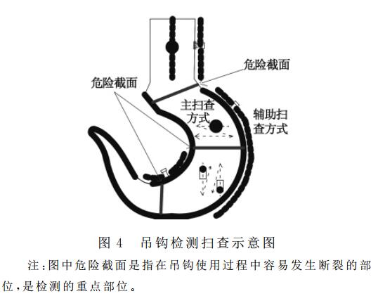 為防止缺陷漏檢,按圖4進(jìn)行掃查直探頭采用接觸式在鉤柄圓柱、鉤腔、鉤腔外圓弧和鉤頭一側(cè)表面垂直于鍛造流線方向做鋸齒形掃查。掃描線按聲程1:1調(diào)節(jié),以2平底孔為掃 查靈敏度,3平底孔為評定線靈敏度,耦合補(bǔ)償用試塊和工件實(shí)際測定。斜探頭在鉤頭兩側(cè)面沿鍛造流線方向做平行掃查和斜探頭在鉤腔內(nèi)表面垂直于鍛造易折疊部位做鋸齒型掃查,掃描線速度按聲程1:1調(diào)節(jié),靈敏度按2.4.3調(diào)節(jié),耦合補(bǔ)償用試塊和工件實(shí)際測定。確因鍛件幾何形狀的限制而掃查不到的部位,應(yīng)予以記錄和圖示,必要時(shí)還應(yīng)得到各方同意。