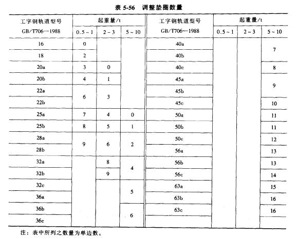 3、由于廠房跨度大小不一,選用工字梁軌道大小不同,因此走輪組件在安裝時應隨工字梁軌道的寬度,用調整墊圈進行調整(見圖5.48),調整墊圈數(shù)量如表5.56所示。
