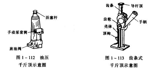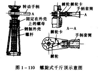 棘輪手柄由棘輪、棘輪卡、手柄套筒組成。還有一種傘齒輪式螺旋千斤頂,如圖1-111所示。扳動操作手柄,經(jīng)過傘形齒輪傳動,將千斤頂升起,這種千斤頂上還裝有一個換向扳鈕,可控制千斤頂?shù)纳蛯?。螺旋前幾單均有自鎖作用,所以重物不會因停止操作而突然下降,也無漏油等故障問題,維護保養(yǎng)也較方便,能在垂直、橫臥或倒放等幾種位置狀況下使用。使用的有5、10、15、30、50t等規(guī)格。手柄操作力有十多公斤到幾十公斤不等,由1-3人操作。