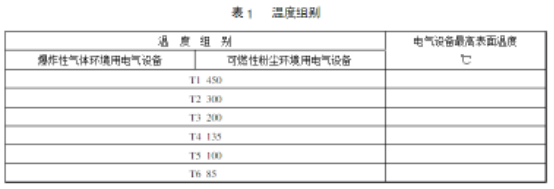II類(lèi)和粉塵類(lèi)防爆葫蘆電氣設(shè)備的極限溫度分組,見(jiàn)表1。