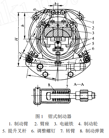 它主要由制動臂1、臂座2、電磁鐵3、制動輪4、轉臂7和制動彈簧8組成。為常閉式制動器,通電時起升電動機旋轉,輸出力矩起吊載荷,同時,制動器電磁鐵吸合,打開制動器;切斷電源時,起升電機制動,鉗式制動器電磁鐵打開,制動臂在彈簧力作用下抱緊制動輪制動載荷。電磁鐵是長行程電磁鐵。