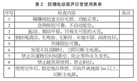 電纜滑車的滾輪材料:防爆電動(dòng)葫蘆電纜滑車的滾輪使用工程塑料材料,避免因摩擦產(chǎn)生火花。防爆電動(dòng)葫蘆使用:按照防爆電動(dòng)葫蘆日常使用表單(見(jiàn)表 2)進(jìn)行檢查和使用,確保了安全生產(chǎn)。