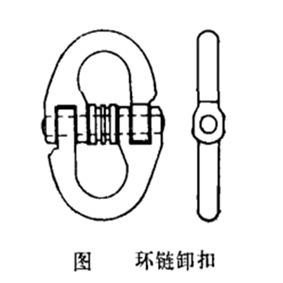 圖中a是U型帶鎖緊螺母卸扣,適于在高處或不易發現其松脫處使用;b為馬蹄形卸扣,具有較大的環腔;c是帶滾輪卸扣;d是長環腔卸扣,適合于不同的使用條件。國外還應用一種適合于鏈條作業用的卸扣,下圖是瑞典公司生產的鏈環卸扣,用它可以靈活地調整鏈條索具的分支或更換夾具。
